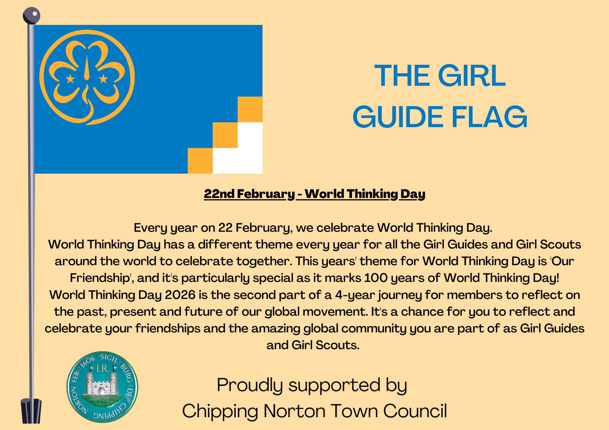 This month, on 22nd February, we flew the Girl Guide and Scouts Flags to celebrate the 100th anniversary of World Thinking Day. World Thinking Day has been celebrated since 1926 and serves as a day of international friendship, reflection, and action for Girl Scouts and Girl Guides around the world. It is an opportunity to think about the global community and the issues that affect girls and young women.