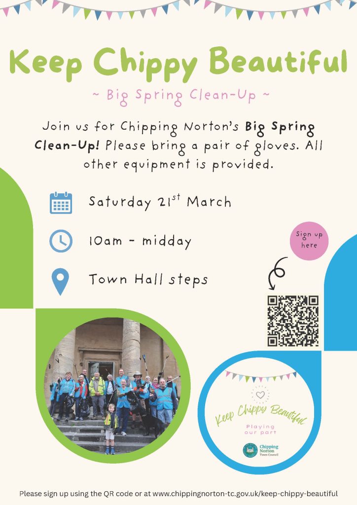 Our next ‘Big Clean-up’ litter pick event will be held on Saturday 21st March from 10am-Midday. Meeting on the steps of Chipping Norton Town Hall.