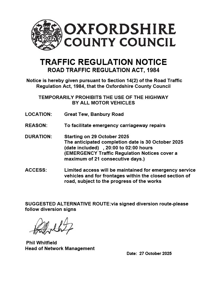 Temporary Emergency Road Closure at Great Tew, Banbury Road