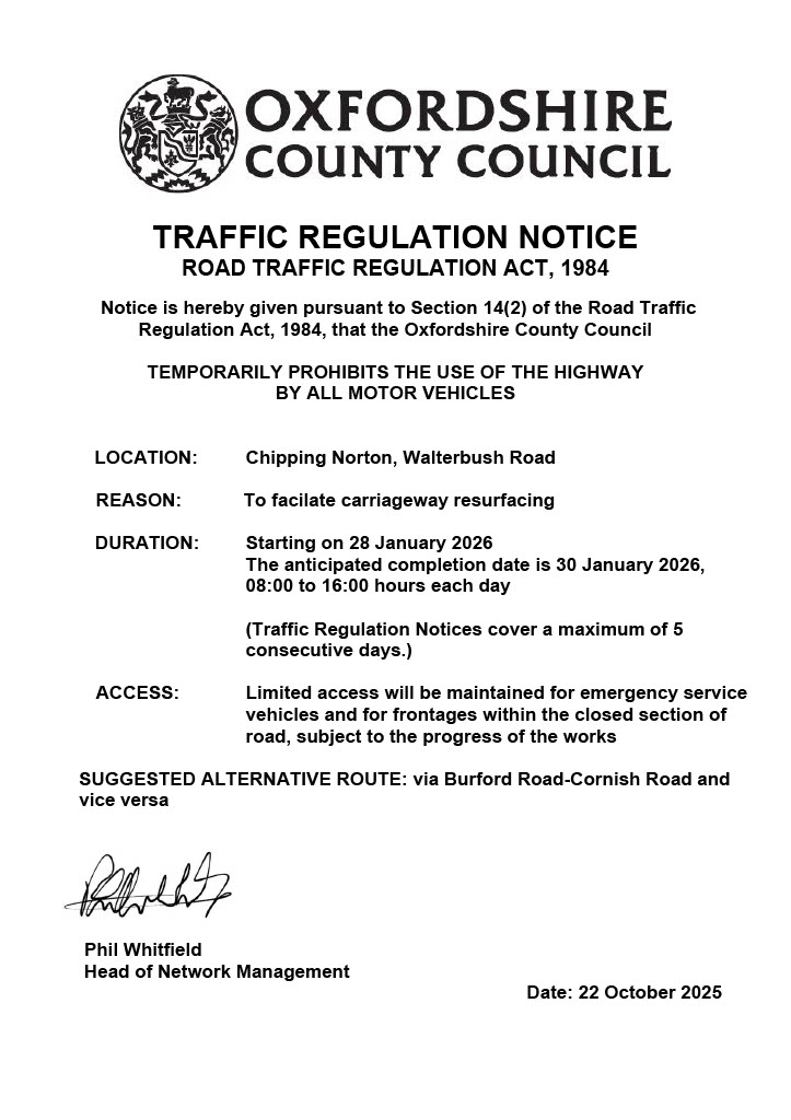 Temporary Road Closure at Chipping Norton, Walterbush Road