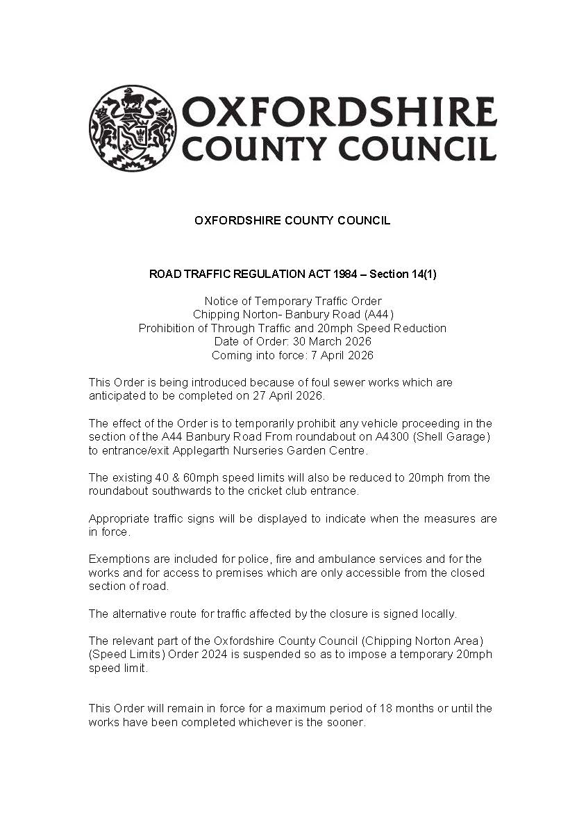 Temporary Road Closure & 20mph Speed Limit – at Chipping Norton, A44 Banbury Road